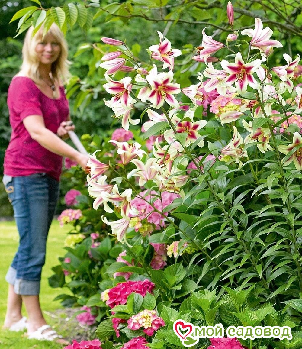 Уход за лилией: Пышных бутонов у лилий можно добиться, соблюдая обычные правила ухода: в первый год лилиям не нужна весенняя подкормка, удобрения вносятся разово за сезон, после цветения. Но это лишь в том случае, если перед посадкой вносилось удобрение. Перед началом цветения высокорослые сорта рекомендуется подвязать. После цветения засохшие бутоны удаляют. Полив умеренный: лучше не долить, чем перелить. Если цветок начал чахнуть и имеются подозрения на перелив – смешайте по столовой ложке речного песка и древесной золы, высыпьте под цветок и не поливайте ближайшую неделю. Полив лилии важно проводить под корень, старайтесь исключить попадание воды на листья, это провоцирует ожоги на солнце и распространение грибковых заболеваний.